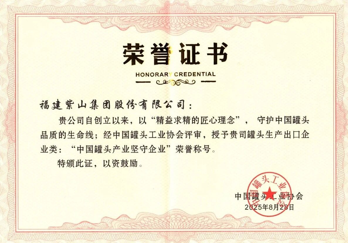 在莊重的“薪火相傳”環(huán)節(jié),紫山集團(tuán)連獲殊榮。集團(tuán)公司榮獲“中國(guó)罐頭產(chǎn)業(yè)堅(jiān)守企業(yè)”榮譽(yù)稱號(hào),這不僅是對(duì)集團(tuán)四十余載深耕罐頭產(chǎn)業(yè)的肯定,更是對(duì)全體紫山人堅(jiān)守品質(zhì)、傳承匠心的褒獎(jiǎng)。