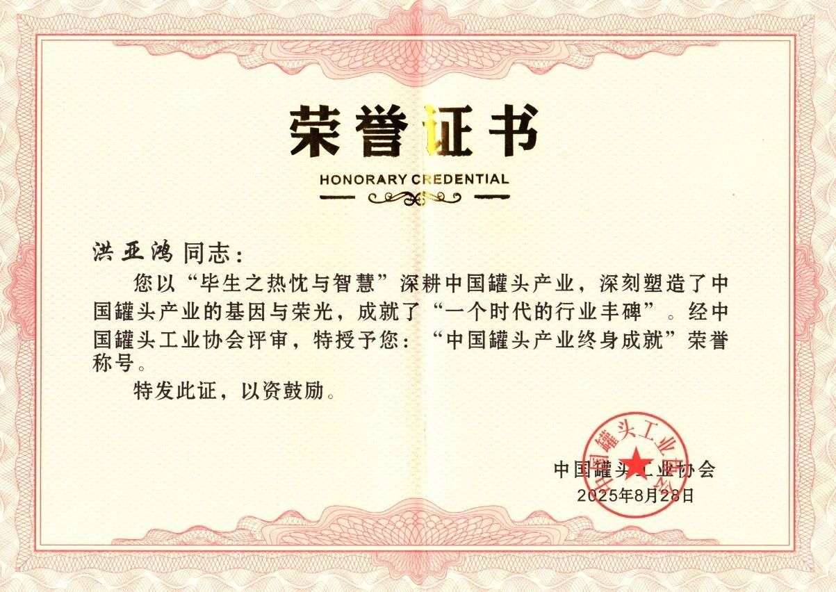 洪亞鴻憑借對(duì)行業(yè)的十年如一日的堅(jiān)守耕耘、卓越貢獻(xiàn),被協(xié)會(huì)授予“中國(guó)罐頭產(chǎn)業(yè)終身成就”與“中國(guó)罐頭產(chǎn)業(yè)堅(jiān)守者”兩項(xiàng)榮譽(yù)稱號(hào)。