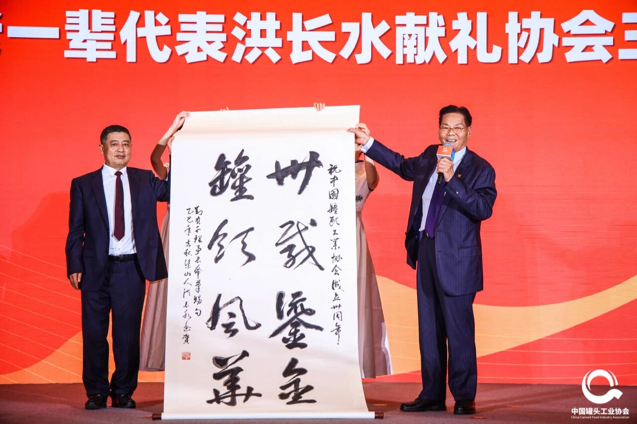 墨韻流芳,丹青寄情。洪長(zhǎng)水董事長(zhǎng)作為行業(yè)老一輩代表現(xiàn)場(chǎng)贈(zèng)送墨寶一卷“卅載鎏金 罐領(lǐng)風(fēng)華”,以此獻(xiàn)禮中國(guó)罐頭工業(yè)協(xié)會(huì)三十華誕,表達(dá)對(duì)行業(yè)未來(lái)的美好祝愿。